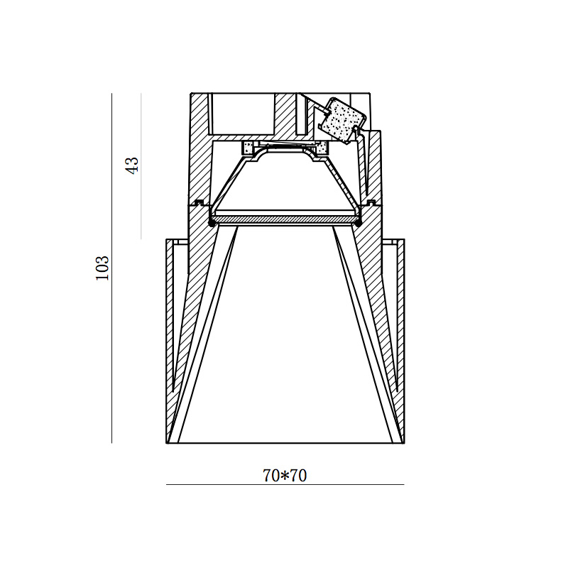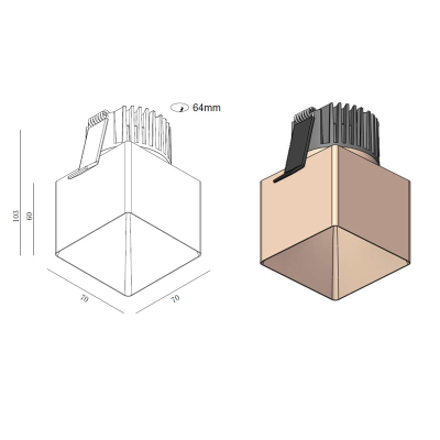| Mått | 70x70mm. Höjd 103mm. Håltagning 62mm. Inbyggnadshöjd: 43mm |