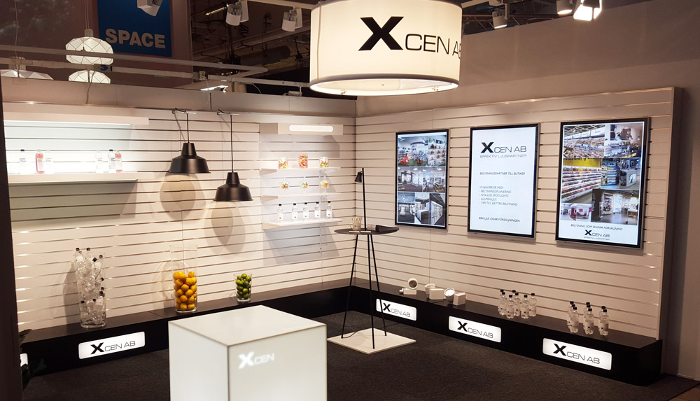 Xcens egna utställning på mässa, ljustavlor och takdisplay samt spotlights på skena. Vi visar även upp andra belysningslösningar.