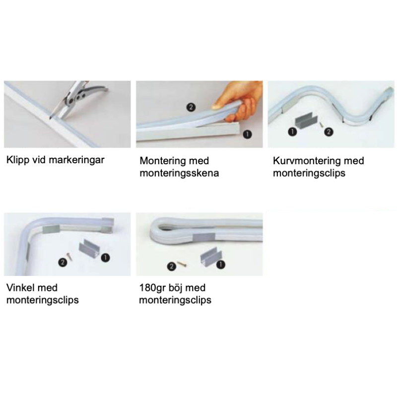 Vid köp av skräddasydda längder går det bra att köpa till monteringsclips (tillbehörskit) under relaterade produkter.