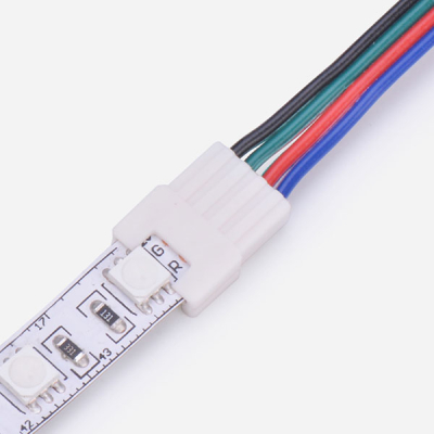 Kontakt med 15cm kabel för att koppla in ledtejp. Kontakten låses på kopparbläcken med en hasp. Genom att använda kontakten slipper man löda fast sladdar. Istället spänner man fast kontakten på ledtejpen och andra änden av sladden kan kopplas till sockerbit för vidarekoppling eller till plint på dimmer eller transformator.
